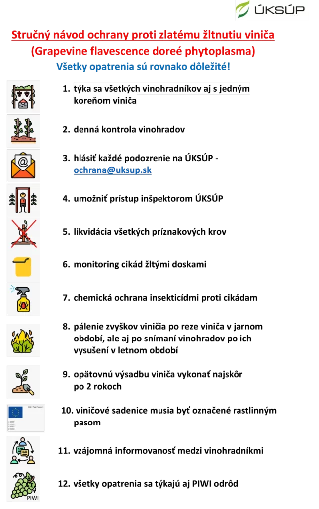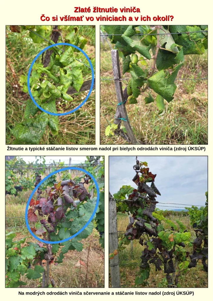 Vzhľadom na rýchly nárast viditeľných príznakov karanténnej choroby viniča s názvom zlaté žltnutia viniča (Grapevine flavescence dorée phytoplasma), Vám odbor ochrany rastlín Ústredného kontrolného a skúšobného ústavu poľnohospodárskeho v Bratislave zasiela naliehavé informácie na zamedzenie šírenia tejto choroby. Všetky tieto informácie boli zároveň zaslané na známe e-mailové adresy aktívnych vinohradníkov a na obecné a mestské úrady obcí, ktoré patria medzi vinohradnícke obce Slovenska (spolu 715 obcí), ktoré môžu kontaktovať fyzické osoby-nepodnikatelia (záhradkári), na ktorých nemáme kontakty, aby získali potrebné informácie. V prílohe Vám zasielame: