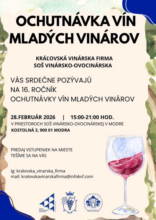 Kráľovská vinárska firma Vás pozýva na Ochutnávku vín mladých vinárov! Príďte ochutnať výnimočné vína slovenských i zahraničných vinárov na 16. ročníku tejto obľúbenej akcie. Zažite jedinečnú atmosféru, objavte nové chute a podporte mladé talenty. Vstupenky si zakúpite na mieste.