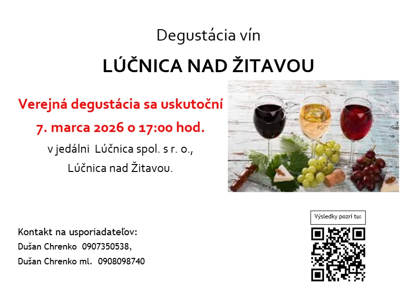 Pozývame Vás do Lúčnice nad Žitavou. Dňa 7. 3. 2026 so začiatkom o 17:00 hod. sa v jedálni Lúčnica spol. s r.o. uskutoční verejná ochutnávka degustovaných vín, hlavne z okolia Vrábel a Požitavia. Súčasťou ochutnávky vín bude aj bohatá tombola. Tešíme sa na Vás.