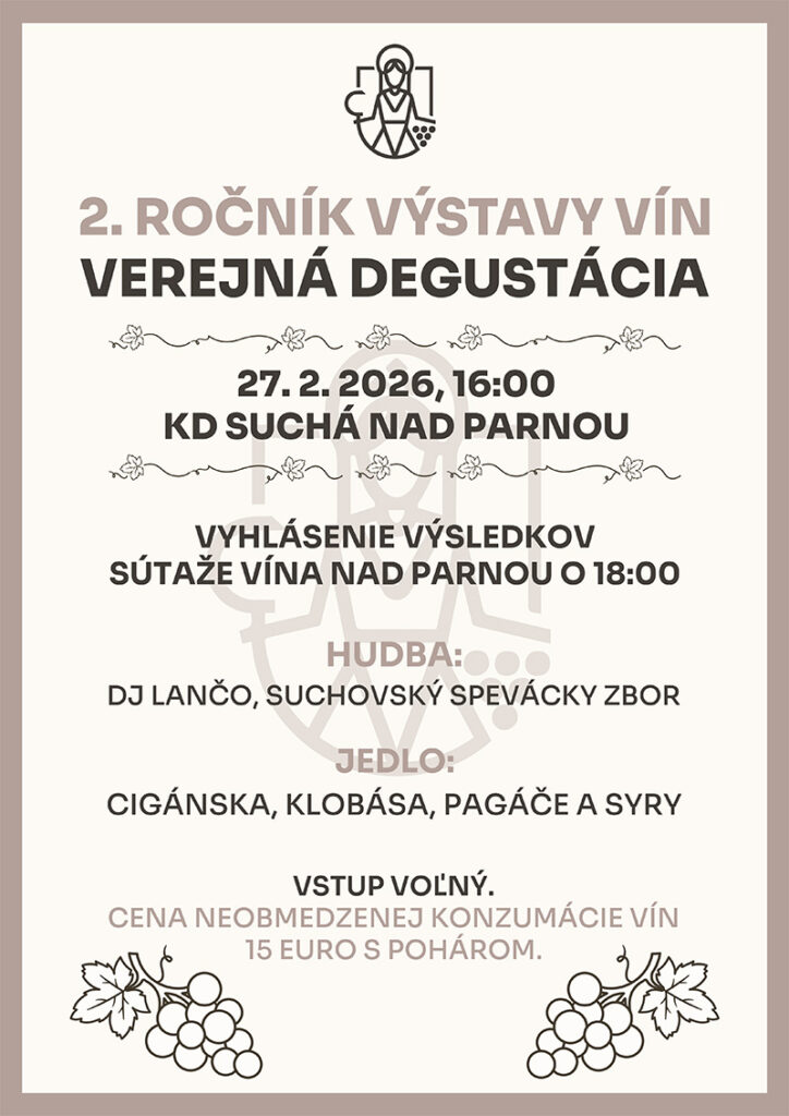 Pozývame Vás na 2. ročník verejnej degustácie vín Vína nad Parnou, ktorá sa uskutoční v Kultúrnom dome Suchá nad Parnou. Termín: 27.2.2026, so začiatkom o 16:00 hod.