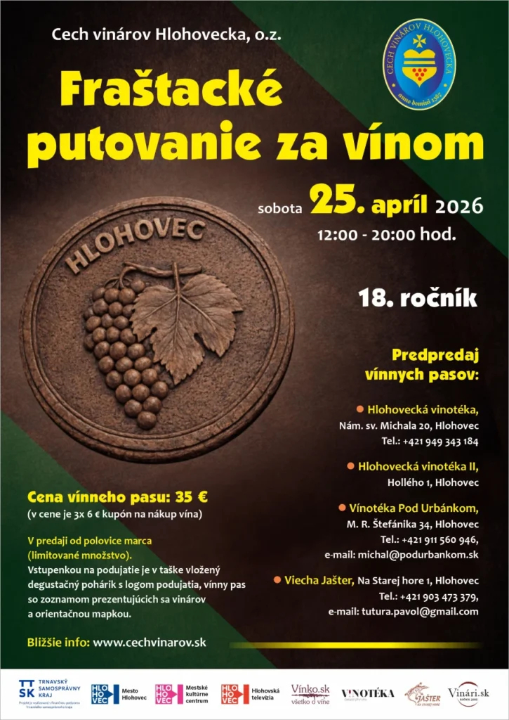 Sobotu 25.04.2026 sa uskutoční už 18. ročník Fraštackého putovania za vínom. V Hlohovci Vám svoje vína predstaví viac ako 50 vinárov z celého Slovenska. Počas podujatia je zabezpečená kyvadlová doprava. Cena vínneho pasu je 35 Eur (obsahuje tašku, degustačný pohárik, vínny pas a kupóny na nákup vín). Podujatie sa bude konať od 12:00 do 20:00 hod.