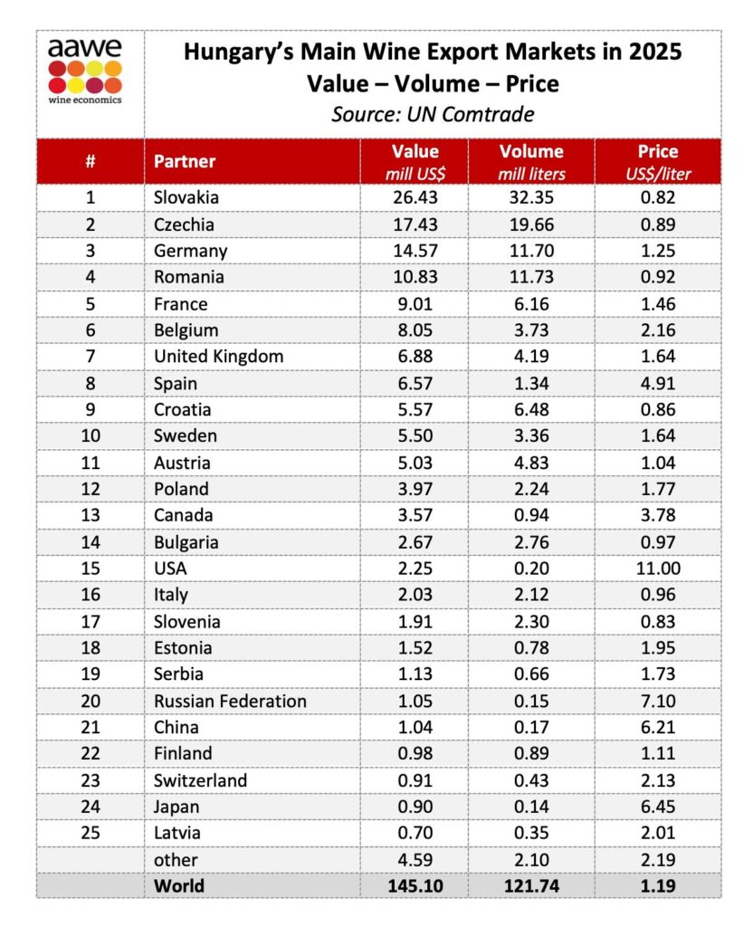 Podľa najnovších štatistík American Association of Wine Economists AAWE sa najviac vína z Maďarska exportuje na Slovensko. Slovensko je pre Maďarsko najdôležitejší exportný trh z hľadiska hodnoty aj objemu, avšak za najnižšiu jednotkovú cenu!